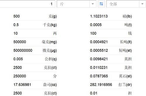 1 市斤 = 500克 (1 克 = 0.002市斤 )