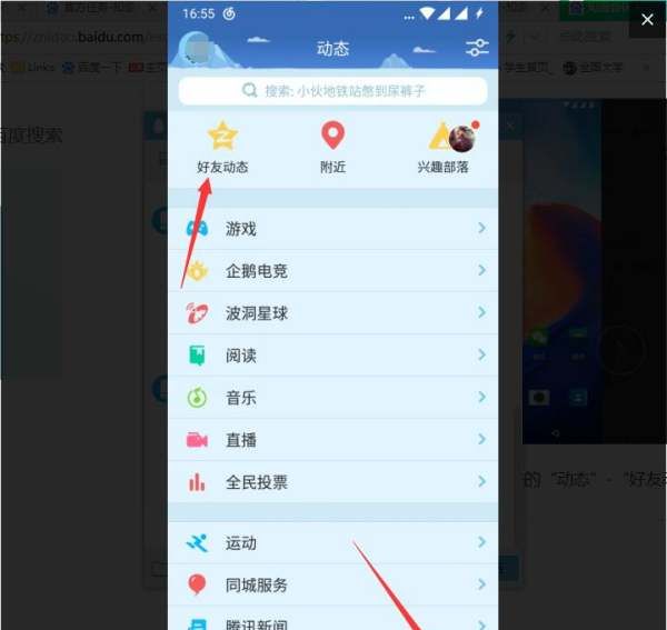 2、接下来进入QQ页面之后,选择红色箭头所指处的“动态”-“好友动态”。