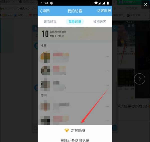 4、接下来进入页面之后,选择“我看过谁”,然后选择需要隐身访问的好友,这时会在页面下方弹出对话框,选择“对其隐身”就可以了。