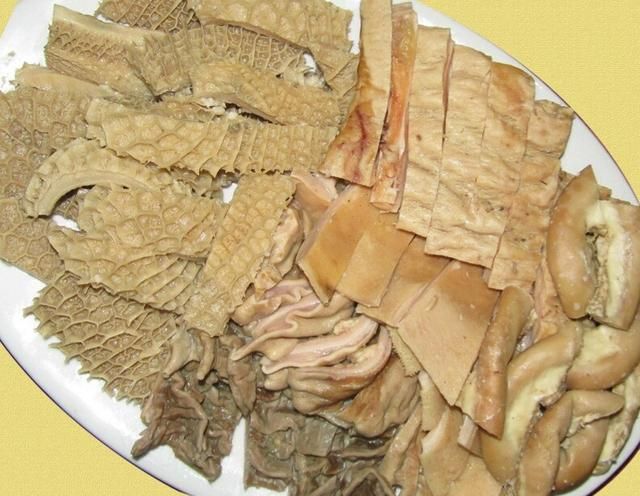 主要用料:牛板肚,牛肠,牛头肉,牛心,牛舌,牛肝,牛舌,牛肺,牛蹄筋。