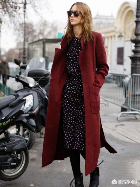 大衣作为御寒衣物外,还可以显得大气场。如果不大喜欢酒红色大衣带来的大气场,不妨在里面穿一件连衣裙。连衣裙可以给人一种小家碧玉的感觉,青春又活泼,加上酒红色大衣,中和了大衣自带的成熟感,还带有一种青春向上的感觉。