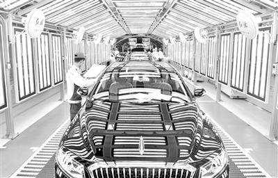 职工在一汽红旗总装车间内进行车辆静检作业。 记者 许畅 摄