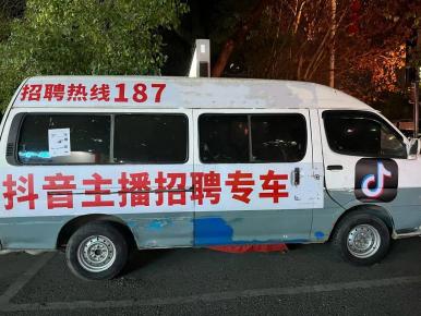 在商业中心,我时常能看到招聘抖音主播的面包车,红色广告贴在车上,写着“抖音主播招聘专车”,凑近看却又从没看到过里面有人,它们就这么停在路边、树下,抖音的Logo贴在车身上,有时还贴着“包培训”和“待遇从优”,确实有些让人心动。