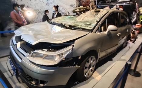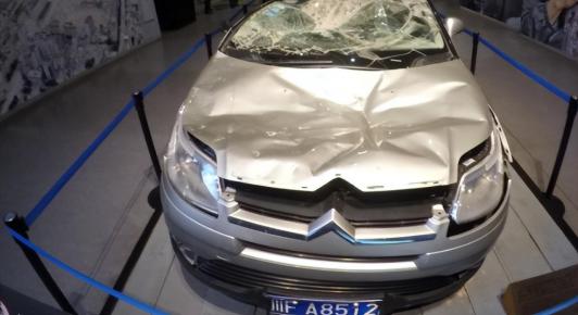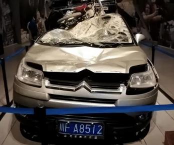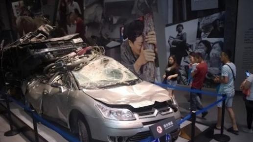但在纪念馆中,有一辆已经损坏了的小轿车放在展馆内很显眼的位置,这辆车车身破损严重,车身上还堆叠着一辆小电动车。