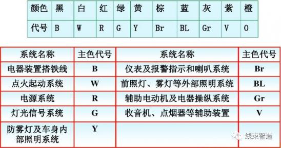 为了便于识别和维修,电线束中的低压电线都采用了不同颜色。电线的各种颜色均用字母表示。