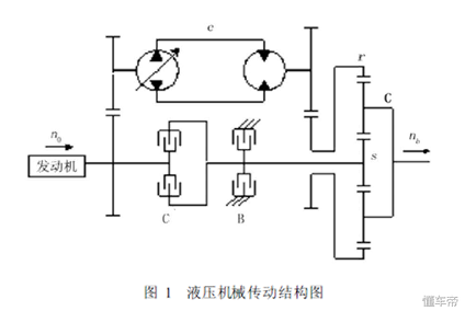 图1为液压机械无级变速传动的基本形式, 发动机输出的功率分成两路, 一路作为机械功率通过离合器直接传给太阳轮s, 另一路作为液压功率, 经传动齿轮后, 通过液压传动系将功率传给齿圈r, 最后功率经差动轮系合成后由行星架c输出。