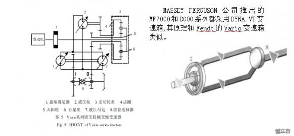 Fendt公司的V ario 系统。其分为0.02-34km /h及0.02~ 50 km /h( 60 km /h )两个速度范围,这是最早实现商品化的, 已发展为从Vario200 到Vario900共6 个产品系列。功率覆盖48-265 kW( 65-360马力), 目前各型号已实现销售50,000台。