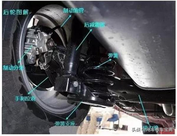 弹簧:弹性元件,起缓冲作用。这个是螺旋弹簧,卡车用的是钢板弹簧,某些高档车用的是空气弹簧。