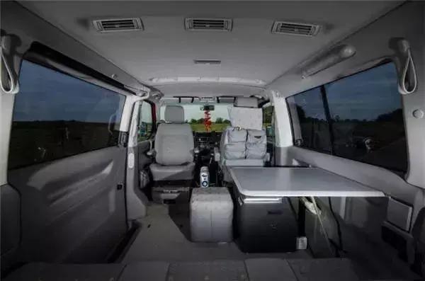 图中可以看到车内重新布置了,车厢中间的是一张桌子,前排驾驶舱的座位可以180度旋转,车顶除了空调出风口之外,还有一个照明灯。