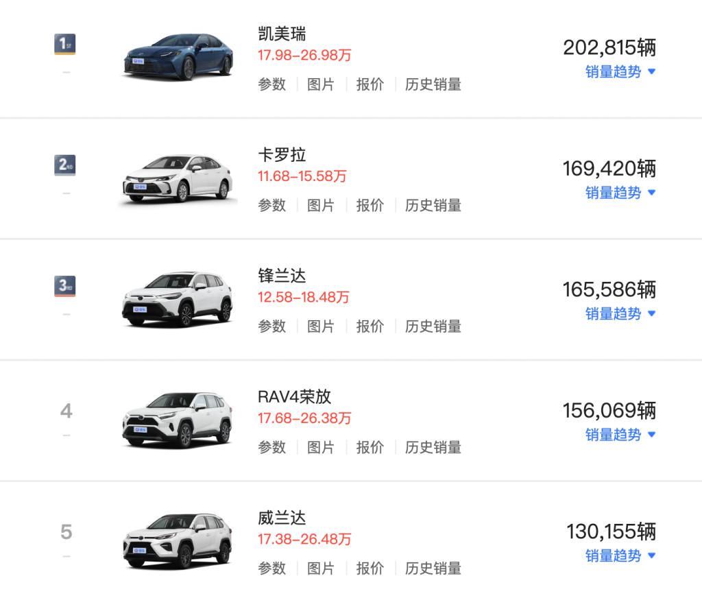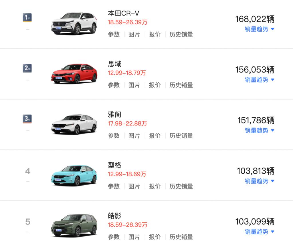 零售数据显示,2023 年前 11 月广汽丰田最畅销的车型是凯美瑞,为 20.28 万辆,锋兰达和威兰达分别为 16.56 万辆、13.02 万辆。广汽本田雅阁、型格、皓影均在 10 万辆以上,其中销量最高的车型是雅阁,售出 15.18 万辆,型格和皓影分别为 10.38 万辆、10.31 万辆。