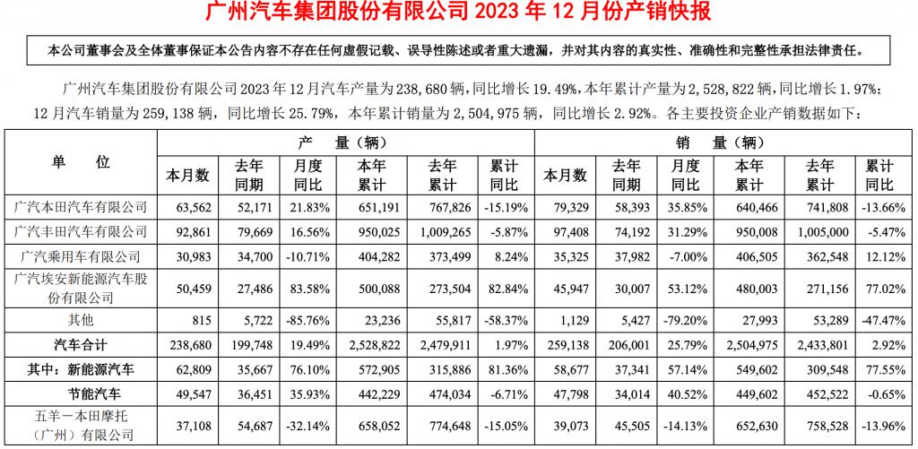 1 月 6 日,广汽集团发布最新产销快报。数据显示,12 月广汽集团汽车销量为 25.91 万辆,同比增长 25.79%。截至 2023 年 12 月底,广汽集团累计销量 250.50 万辆,同比增长 2.92%。按照 2023 年销量同比增长 10% 的挑战目标,广汽集团在 2023 年的总销量将约达 264 万辆,广汽集团显然未能完成目标。