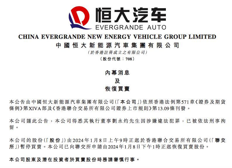 在 1 月 8 日早间公告短暂停牌之后,恒大汽车于午间再发公告称,公司执行董事刘永灼因涉嫌违法犯罪,已被依法刑事拘留。