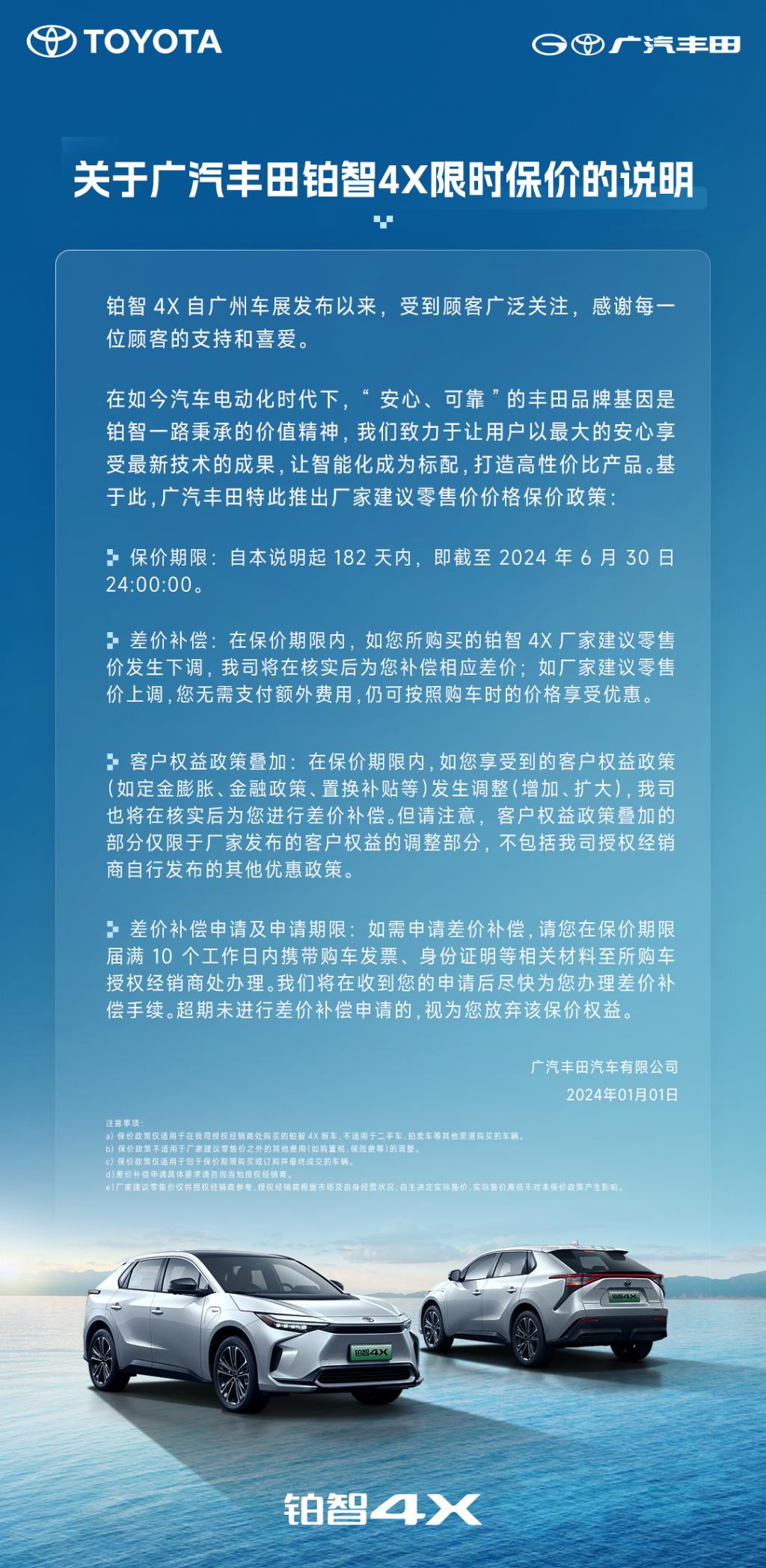 IT 之家 1 月 7 日消息,广汽丰田公布铂智 4X 限时保价政策,截至 2024 年 6 月 30 日 24 点,在保价期限内车辆建议零售价发生下调,官方将补偿相应差价;价格上调则无需支付额外费用,仍可按照购车时的价格享受优惠。