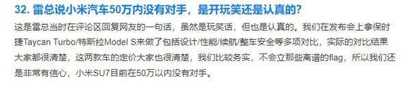 对此,小米汽车官方称:这是雷总当时在评论区回复网友的一句话,虽然是玩笑话,但也是认真的。我们比较务实,不会立那些离谱的 flag,所以我们还是非常有信心,小米 SU7 目前在 50 万以内没有对手。