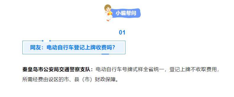 电动自行车上牌费用:根据秦皇岛市公安局交通警察支队介绍,电动自行车号牌式样全省统一,登记上牌不收取费用,所需经费由设区的市、县(市)财政保障。