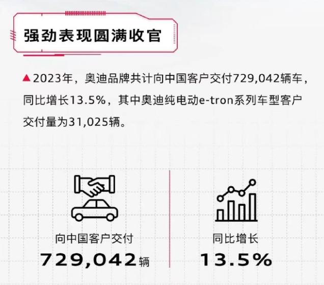 奥迪虽表现不及宝马与奔驰,但 13.5% 的增长幅度在豪华品牌中相当抢眼,奥迪也借此大幅度拉近了两者之间的距离——全年共计交付超过 72.9 万辆车,与奔驰的差距不到 4 万辆。值得一提的是,奥迪纯电动 e-tron 系列车型累计销量达到 31025 辆,出色的销量表现为奥迪电动化转型发展奠定了基础。2024 年第一季度,奥迪加强电动化攻势的关键之作 Q6 e-tron 将全球亮相。