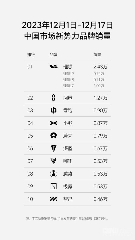 具体来看,2024 年 1 月 1 日 -14 日,在中国市场新势力品牌销量排名中,问界以 1.28 万辆登顶第一,理想则以 1.10 万辆紧随其后,此外,深蓝、零跑、极氪、蔚来、腾势和岚图均位列小鹏之前。排名第九的小鹏两周累计销量仅 0.28 万辆,比 0.25 万辆的智己没有多出多少。