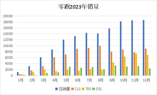 另外,零跑还上了双保险。2022 年 9 月,零跑推出了第二款肩负品牌上探责任的车型 C01(14.98 万 -22.88 万元)。不过,它的成绩不如 C11。目前零跑共有三款车型在售,除了 C11 和 C01 ,还有 T03 ,而 C01 是三者中销量最少的车型。