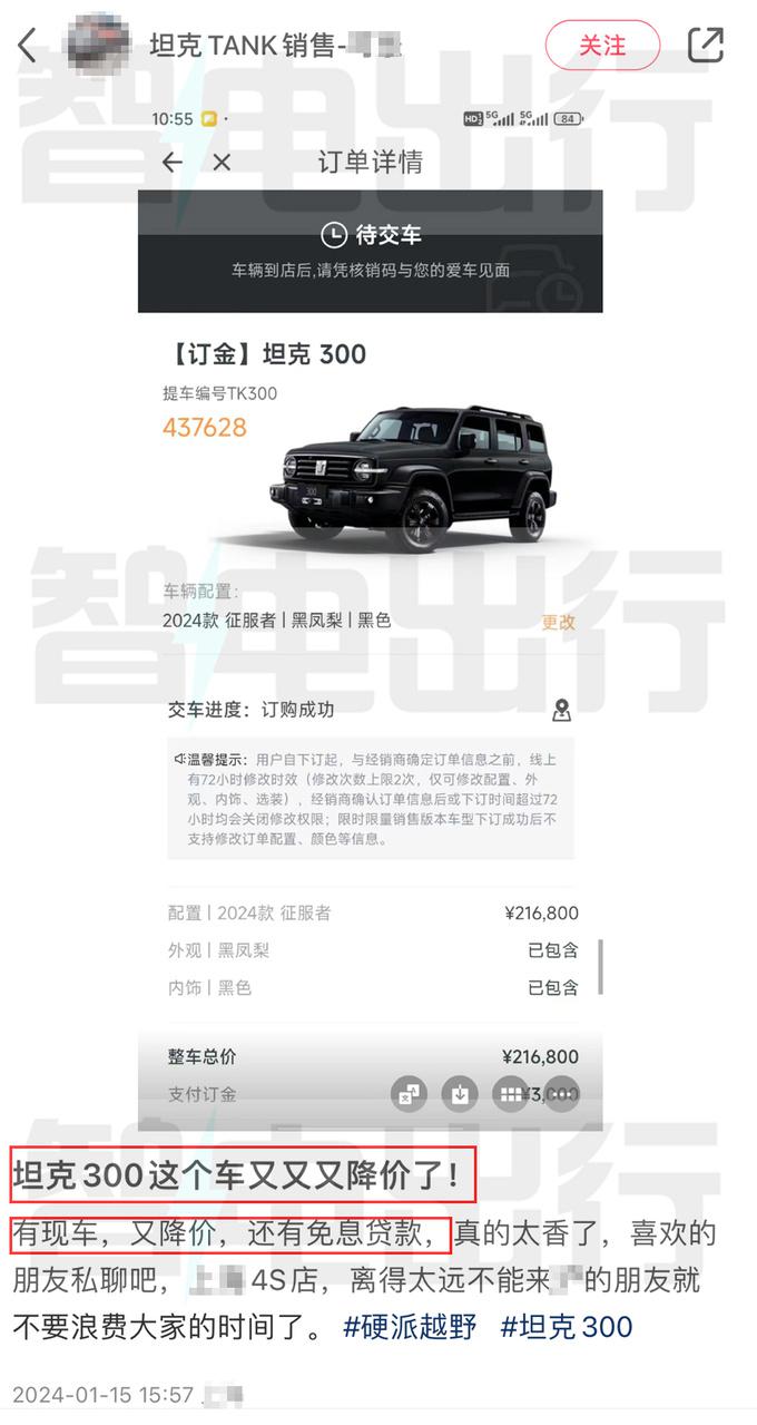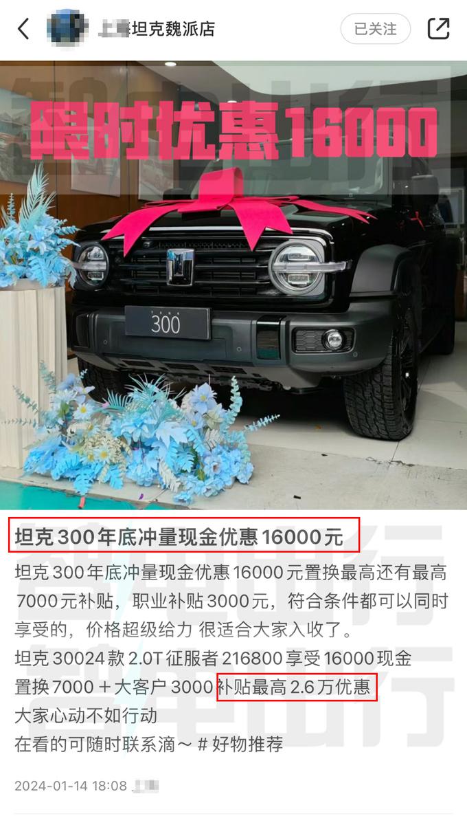 文件显示,在坦克 300 Hi4-T 未正式上市前,可以考虑购买燃油版或坦克 400/500,它们同样具有产品优势和交付周期。随着春节假期的临近,部分坦克经销商进入到年底冲量阶段,目前坦克 300 燃油版现金优惠达到 1.6 万元,综合补贴最高可达 2.6 万元。