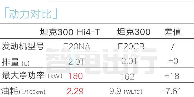 坦克 300 Hi4-T 与坦克 500 Hi4-T 搭载相同的 2.0T 发动机和三元锂电池组,电机功率 120kW,动力蓄电池组总能量 37.11kWh,匹配纵置 9AT P2 变速器。新车纯电续航里程可达 105km,燃料消耗量为 2.29L/100km。