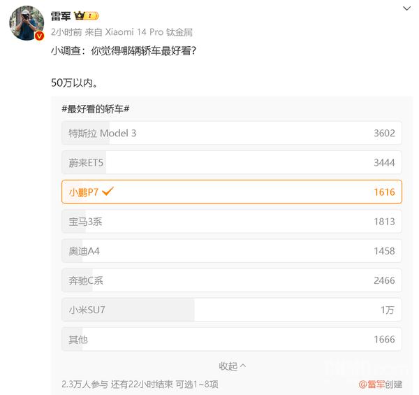 选项包括特斯拉 Model 3、蔚来 ET5、小鹏 P7、宝马 3 系、奥迪 A4、奔驰 C 系以及小米 SU7。截至目前,共有 2.3 万人参与投票,超 1 万人选择 " 小米 SU7"。此外,选择特斯拉 Model 3 和蔚来 ET5 的人最多,超过了 3000 人。雷军不禁好奇称 " 为啥这么多人觉得 Model 3 好看?"