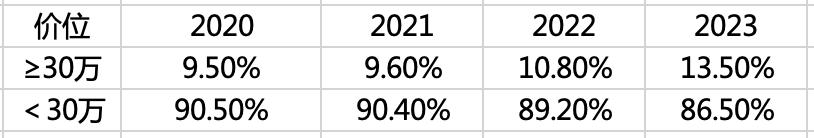 上面提到乘联会统计的豪华品牌,没有包含自主高端车型,但是乘联会有另一个统计,就是售价 30 万以上及以下的两个区间,在 2023 年出现了非常值得玩味的变化: