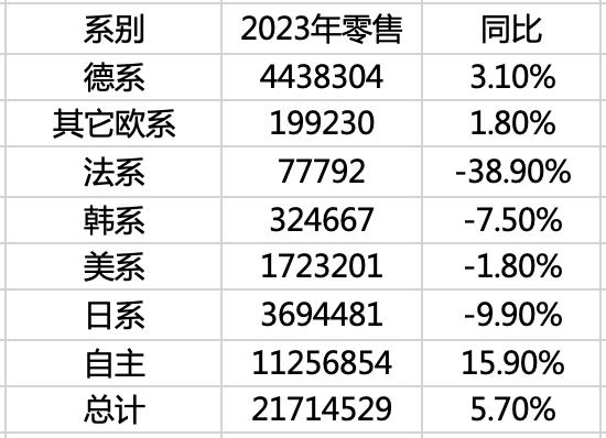 但是到了 2023 年,德系终于稳住了自己的份额,并实现了小幅度的上涨;美系品牌虽然仍在下滑,但跌幅只有不到 2%;至于日系品牌,按照乘联会的零售量数据,2023 年日系品牌总计销量为 369 万辆,同比下滑了接近 10%,和德系的差距拉大到了近 80 万辆。