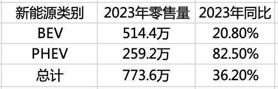据乘联会数据,2023 年国内新能源车型总的零售量是 773.6 万辆,同比增长 36.2%,其中 BEV 纯电车型销量占了三分之二,远高于 PHEV 车型,但是纯电车型的增速只有 20.8%,而 PHEV 车型同比则大涨了 82.5%。
