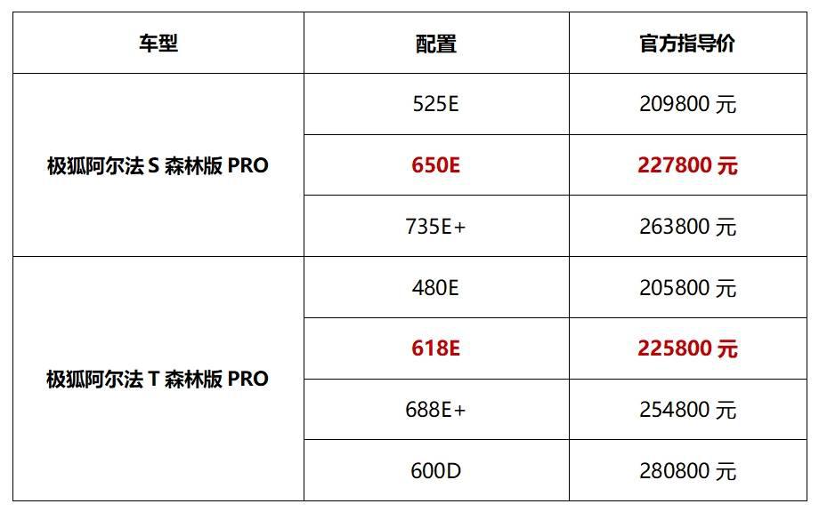 1 月 25 日,极狐阿尔法 S/T 森林版 PRO 整体在原森林版基础上,围绕前后排座椅加热 / 按摩、真皮方向盘、热泵空调等豪华、舒适性配置进行多维升级。其中,配置升级价值最高的版型为阿尔法 S 森林版 PRO 525E 版,主要增加了方向盘加热、驾驶席座椅通风 / 按摩、副驾驶席座椅通风 / 按摩等多项实用性配置,价值高达 1.6 万元。再加上至高 4 万元的购车权益,用户至高可享 5.6 万元的超级宠粉福利。同时,极狐汽车还新增了阿尔法 S 森林版 PRO 650E、阿尔法 T 森林版 PRO 618E 两款车型,官方指导价分别为 22.78 万元、22.58 万元,让用户在续航里程上有了更丰富的选择。