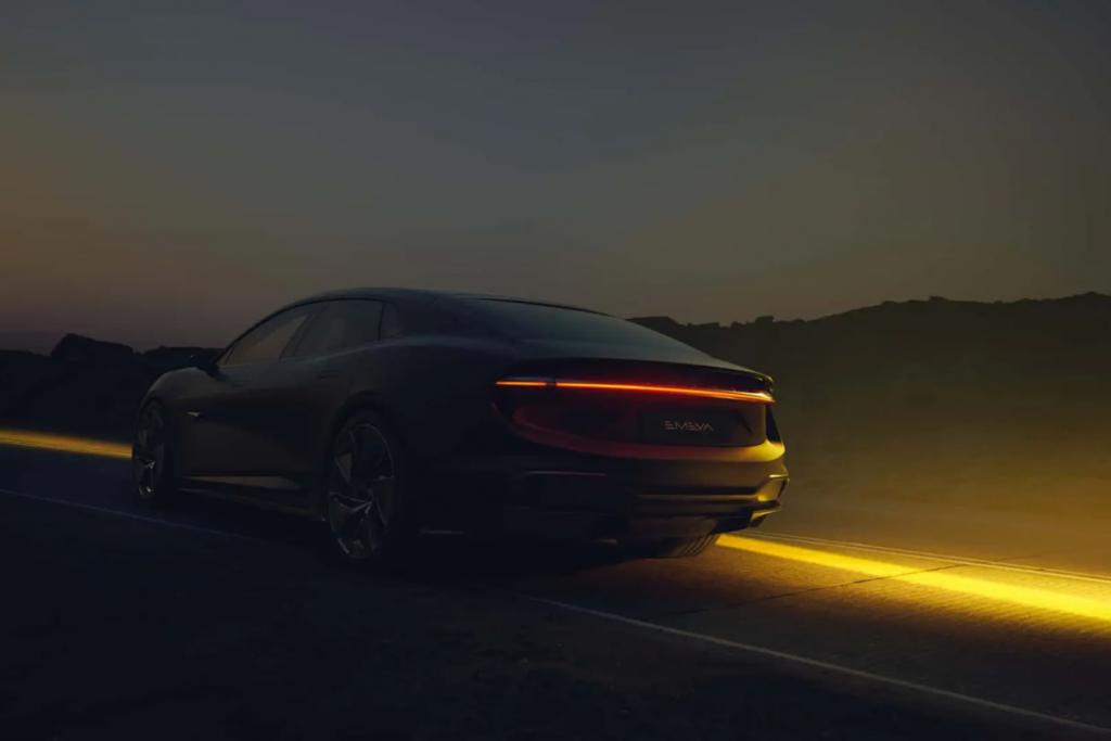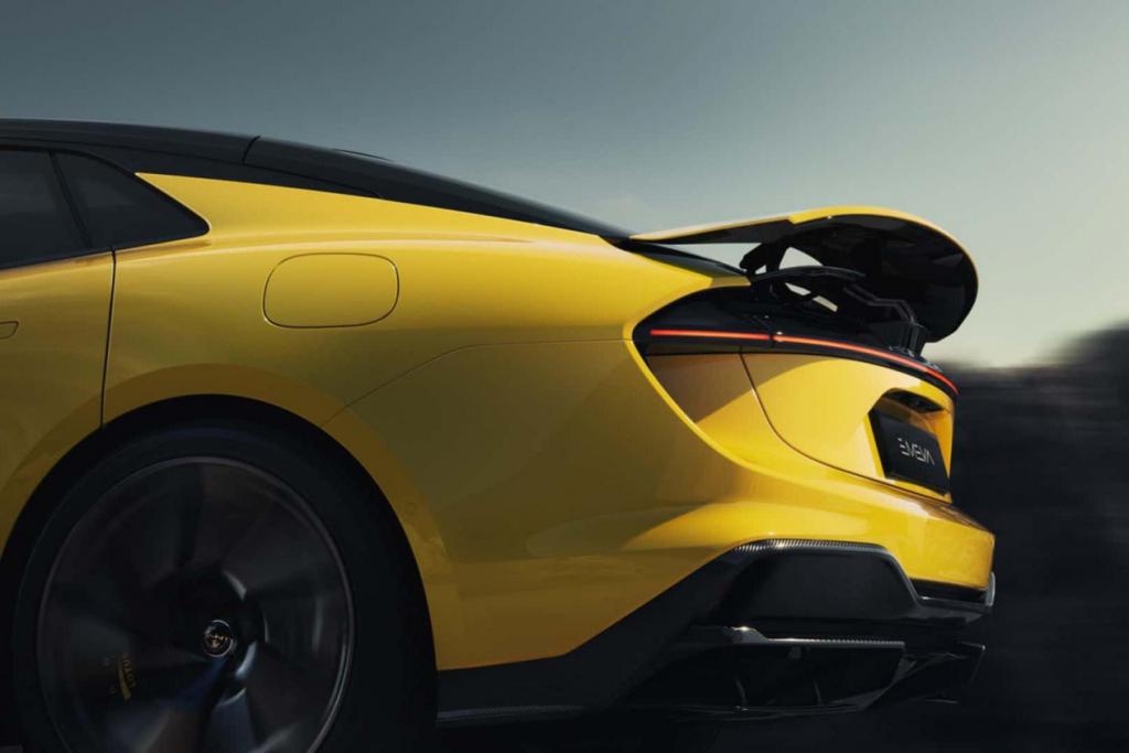 车身尾部,EMEYA 搭载了的可升降式双层尾翼,高速行驶时可提供 215kg 的最大下压力,这些先进的空气动力学设计,让它看起来比同样是四门的保时捷 Taycan 更像一辆超跑。