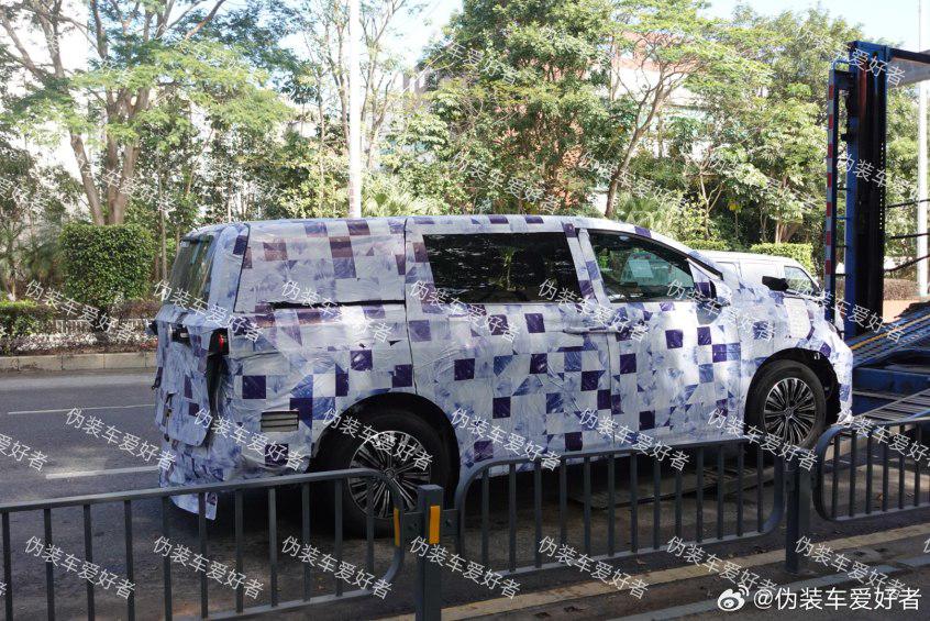 车尾部分的设计同样保持了方正的基调,给人一种沉稳的感觉。尾灯被放置在车尾两侧,简洁而醒目。值得一提的是,新车的尾部转角设计与腾势 D9 颇为相似,展现出一种内敛的美感。由于伪装的厚重,目前我们暂时无法窥探到更多的细节设计。