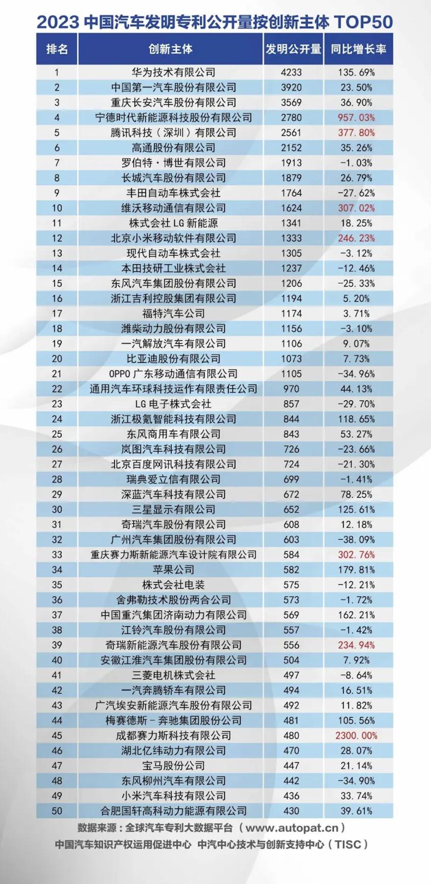 中汽信科近日发布了 2023 年汽车专利统计分析。2023 年中国汽车发明专利公开量按创新主体统计 TOP50 中,华为以 4233 件,135.69% 的同比增长率位居第一。