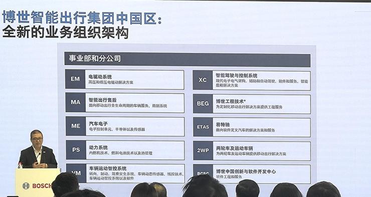 王伟良介绍,全球范围内,博世智能出行集团将包括 12 个事业部和五大地区。在中国,则分为 10 个业务部和分公司,包括电驱动系统、智能出行售后、汽车电子、动力系统、车辆运动智控系统、智能驾驶与控制系统、博世工程技术、易特驰、两轮车及运动车辆、博世中国创新与软件开发中心。