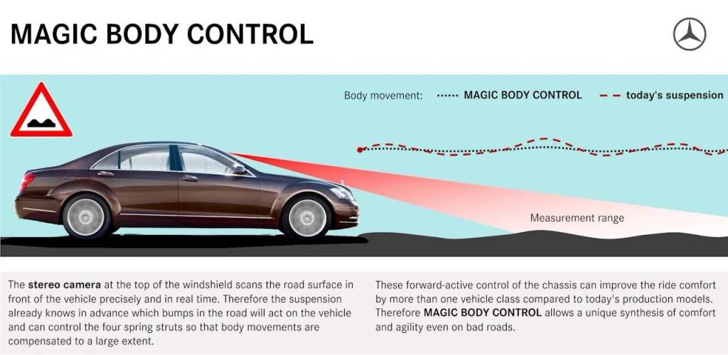 相比之下,奔驰的「魔毯悬架」(Magic Body Control)采取了一种更先进的方法。它使用摄像头预先扫描道路表面,识别前方的凸起和坑洞,并在车辆到达这些地方前,对悬架进行调整。
