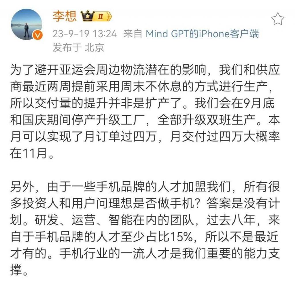 去年,蔚来推出 NIO Phone 后不久,vivo 美女产品经理宋紫薇跳槽至理想汽车,引发投资人和用户对理想汽车下场造手机的猜疑。厂长专文回应,没有做手机的计划,但 " 手机行业的一流人才是理想汽车重要的能力支撑 "。