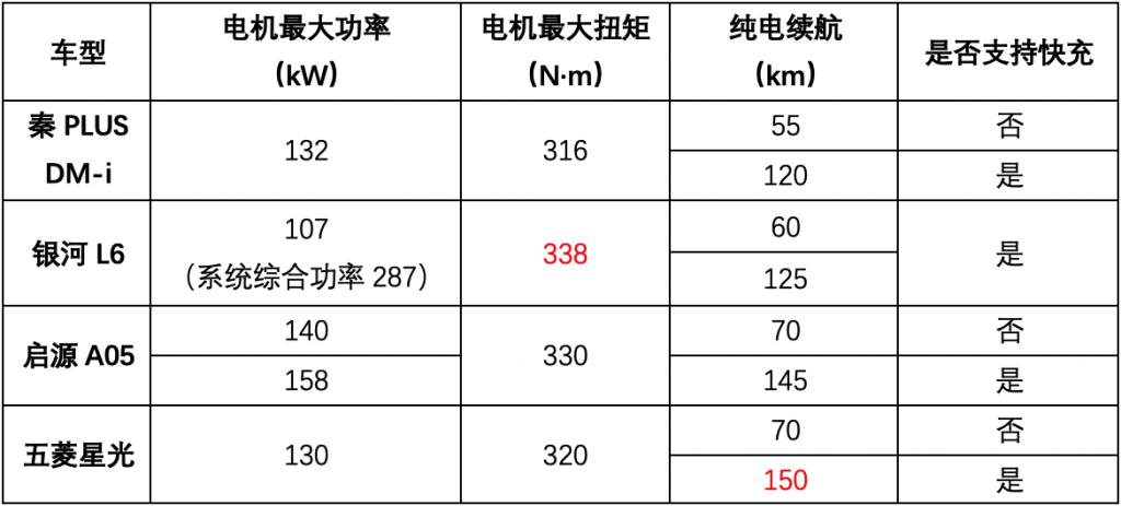 动力方面,银河 L6 由于混动系统采用 3DHT 结构,动力性能比其余 1DHT 结构的车型更强;另外银河 L6 全系支持快充,即便是纯电续航 60km 的车型也能快充。纯电续航方面,五菱星光和启源 A05 的长续航版本续航较长,达到 150km 左右。