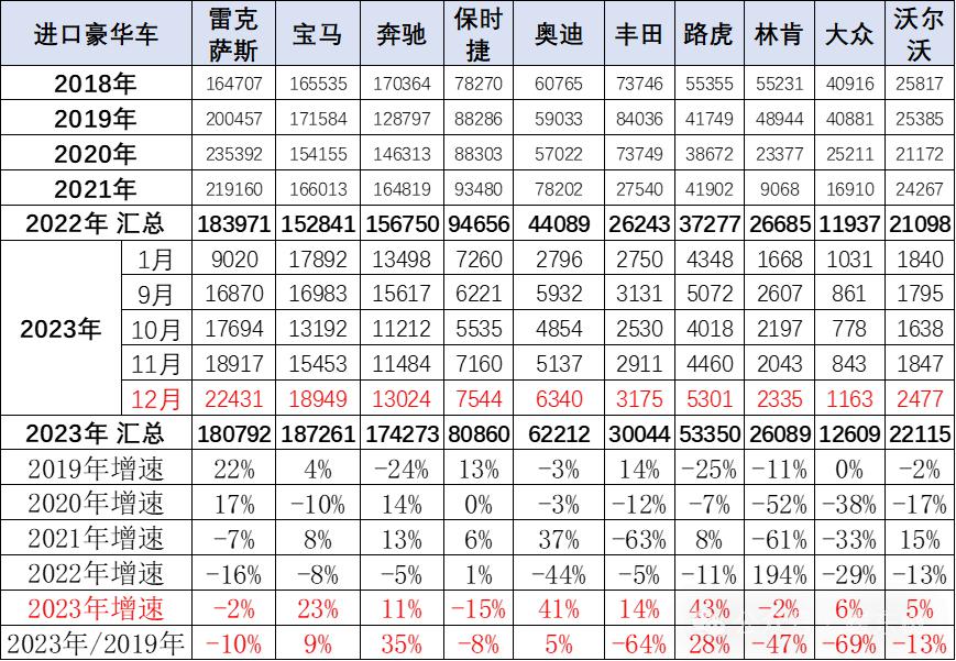从品牌销量也能看出,在 2023 年,进口 BBA 销量都出现了大幅提升,其中进口宝马同比上涨 23%、进口奔驰同比上涨 11%、进口奥迪同比上涨 41%。