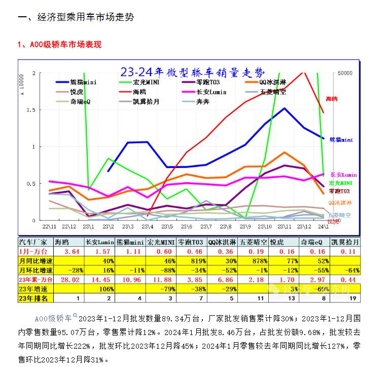 2024 年 1 月,A00 级轿车批发 8.46 万台,占批发份额 9.68%,批发较去年同期同比增长 222%,批发环比 2023 年 12 月降 45%。