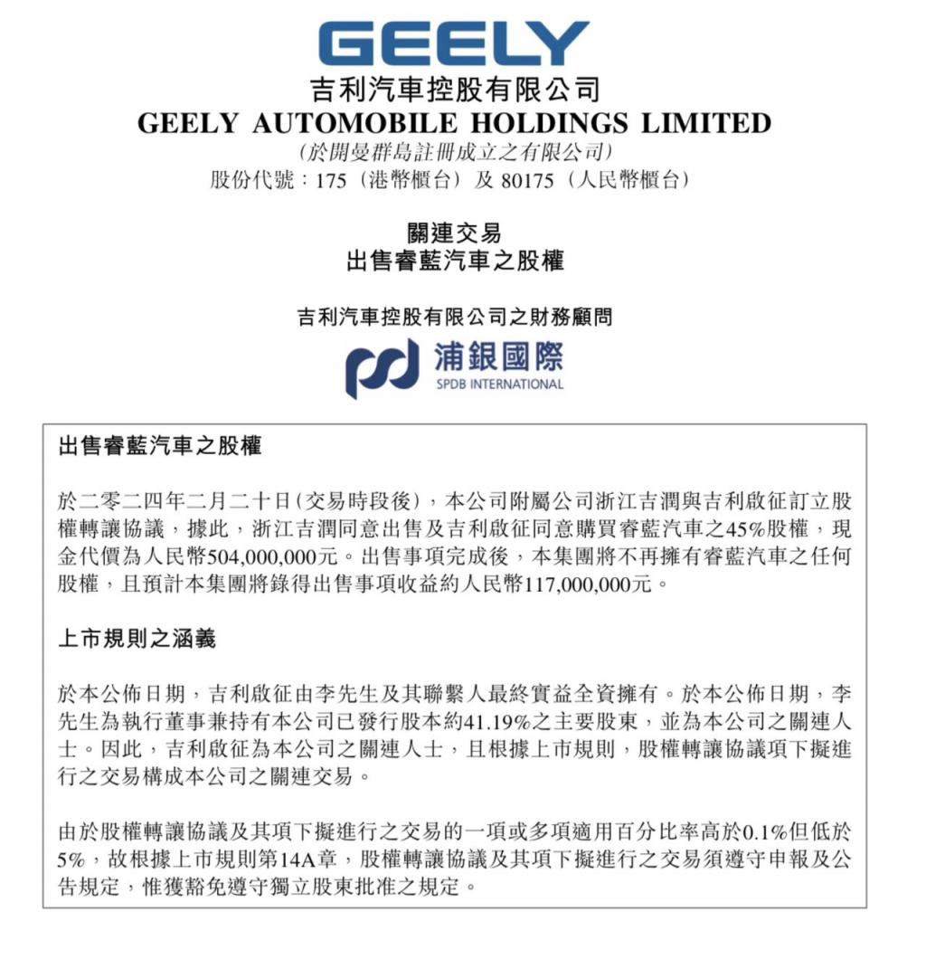 最新公告显示 , 吉利集团旗下的浙江吉润汽车有限公司与吉利汽车集团启征有限公司签署了股权转让协议。根据协议 , 浙江吉润汽车有限公司同意出售其持有的睿蓝汽车 45% 的股权 , 吉利汽车集团启征有限公司同意购买这部分股权 , 交易价格为人民币 5.04 亿元。本次交易完成后 , 吉利集团将不再持有睿蓝汽车的任何股权。预计吉利集团将通过这次出售获得约人民币 1.17 亿元的投资收益。出售完成后 , 睿蓝汽车的股权结构将变更为力帆汽车控股集团持有 55% 股权 , 吉利汽车集团启征有限公司持有 45% 股权。