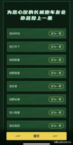 目前来看,排名前三的车友会名称为“炮野联盟”、“炮炮堂”、“炮行天下”,第一的票数已接近了三千票,不知道后续是否会有反转。