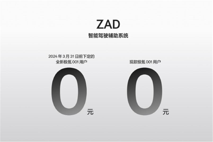 值得注意的是,全新极氪 001 还在权益方面加码,3 月 31 日前下定的用户可 0 元开通 ZAD 完全智能辅助驾驶系统,包含城市高速 NZP、城市 NZP 所有智驾功能终身免费。