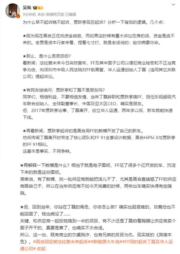 3 月 5 日,汽车博主 @吴佩 分析了背后的几点逻辑。该博主认为,因为现在高合正在找资金自救,而如果这时候有重大诉讼在身的话,资金是进不来的。贾跃亭又是资本行家,捏着七寸打,就是老话说的:趁你病要你命。