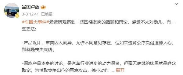 卢放在微博中表示,最近自己观察到一些围绕友商(这里指的应该就是理想)的话题和舆论,感觉不太对劲,有一些想法:产品设计审美因人而异,允许不同意见存在,但如果违背公序良俗和道德人心,那就是丧失底线。