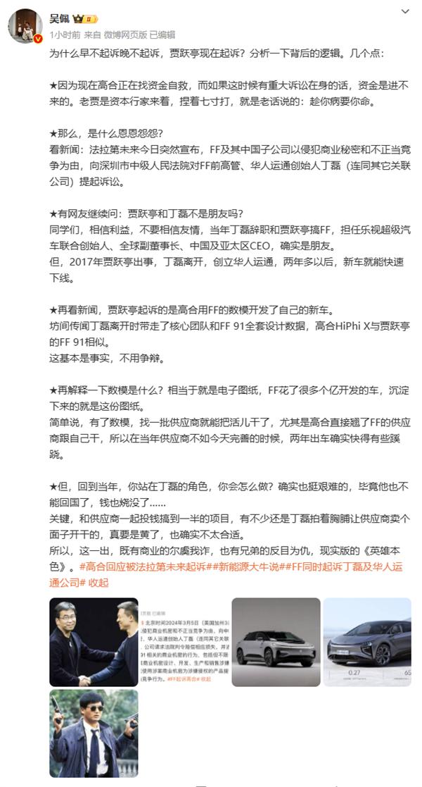 博主分析贾跃亭起诉高合逻辑:趁你病要你命