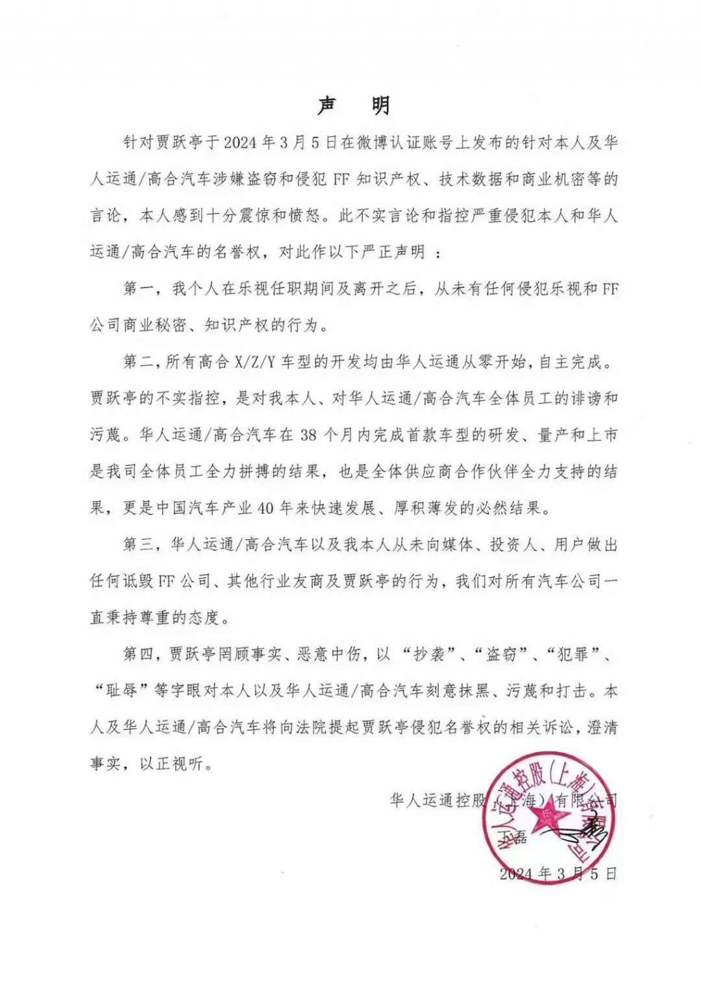 丁磊在声明中指出,贾跃亭罔顾事实、恶意中伤,以 " 抄袭 "、" 盗窃 "、" 犯罪 "" 耻辱 " 等字眼对本人以及华人运通 / 高合汽车刻意抹黑、污蔑和打击。将向法院提起贾跃亭侵犯名誉权的相关诉讼,澄清事实,以正视听。