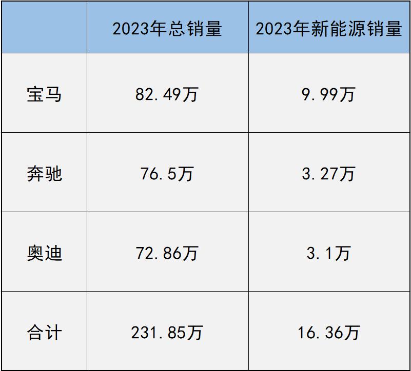 去年,奔驰、宝马、奥迪在华销量均超过 70 万辆,三者合起来在豪华品牌市场中占比超过 60%,然而,他们三家的新能源车加起来仅为约 16.3 万辆,只相当于某二线新势力车企。