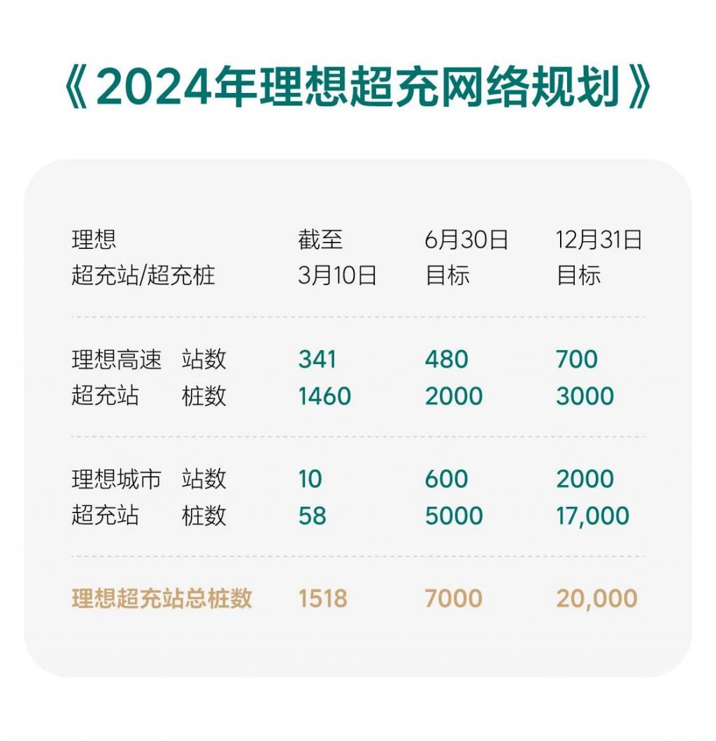 到今年年底,理想汽车计划将在全国建成 2,700 座超充站(20,000 个充电桩),其中城市建成 2,000 座超充站(17,000 个充电桩),实现一二三线城市超过 60% 的城区覆盖;高速建成 700 座超充站(3,000 个充电桩),实现对国家级高速超过 70% 的覆盖。