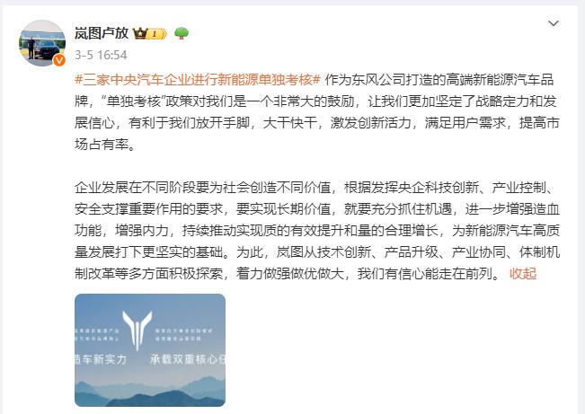 岚图 CEO 卢放在其微博表示,作为东风公司打造的高端新能源汽车品牌," 单独考核 " 政策是一个非常大的鼓励。