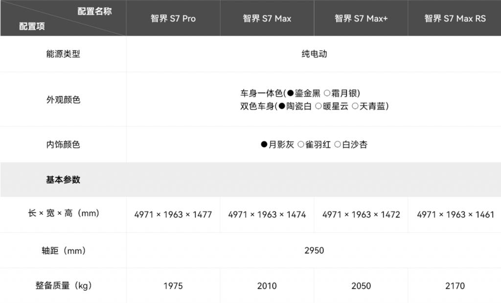 智界 S7 Max RS 版本:长 4971mm、宽 1963mm、高 1461mm,轴距 2950mm,整备质量 2170kg