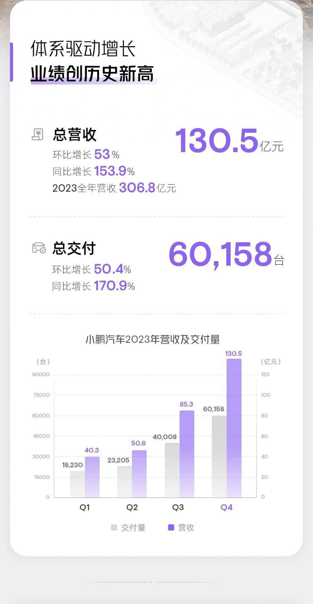 3 月 19 日,小鹏汽车(NYSE:XPEV/HK.9868)公布 2023 年第四季度财报。财报数据显示,小鹏汽车 Q4 营收 130.5 亿元,同比增长 154%,环比增长 53%;季交付量 60,158 辆,同比增长 171%,环比增长 50%。